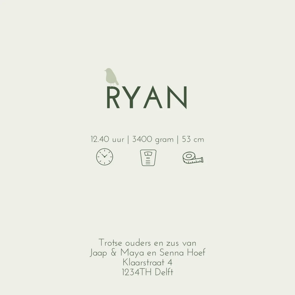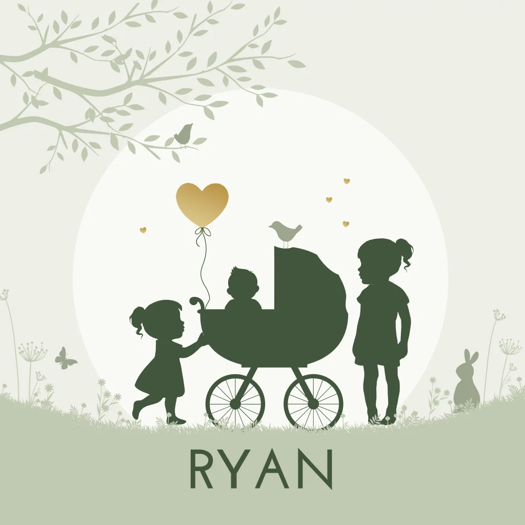 Geboortekaartje 3e kindje jongen in een kinderwagen met2 grote zussen naast de wagen. De baby ligt in een kinderwagen en de kaart is mooi versierd met dieren en natuur. De kleuren groen zijn naar wens aan te passen (30362) Geboortekaartje Ryan.