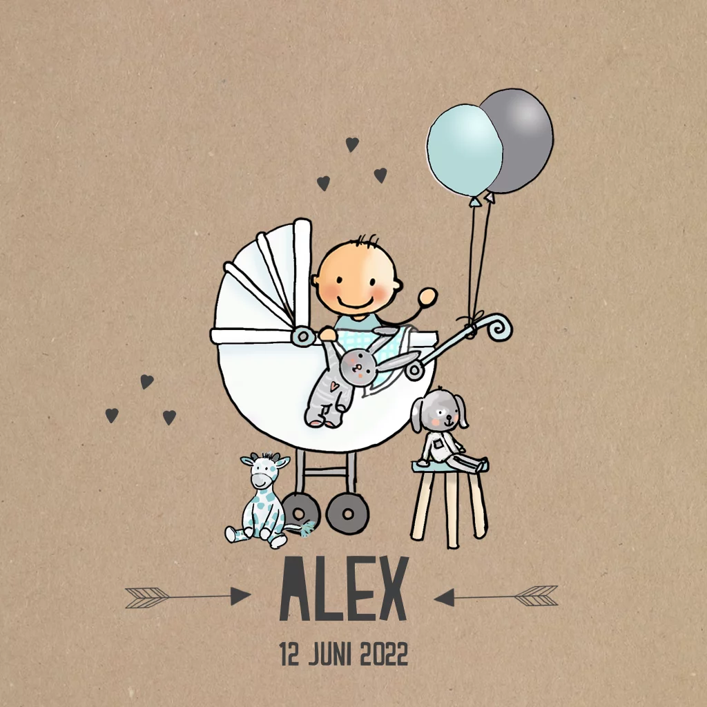 Geboortekaartje jongen kinderwagen met ballonnen, leuke pijltjes en hartjes met vogeltjes, super lief geboortekaartje. (5040)