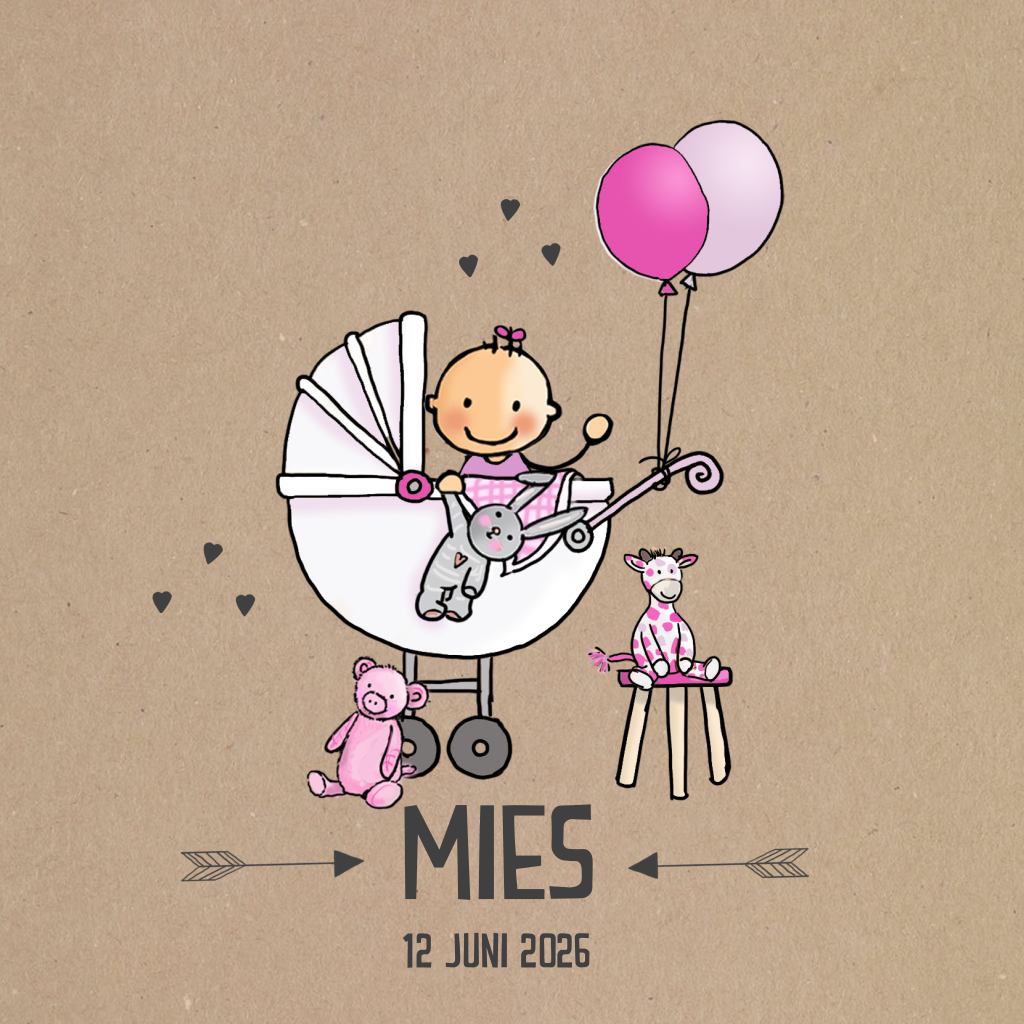 Geboortekaartje kinderwagen baby meisje en ballonnen, leuke pijltjes en hartjes met vogeltjes, super lief geboortekaartje. (5039)