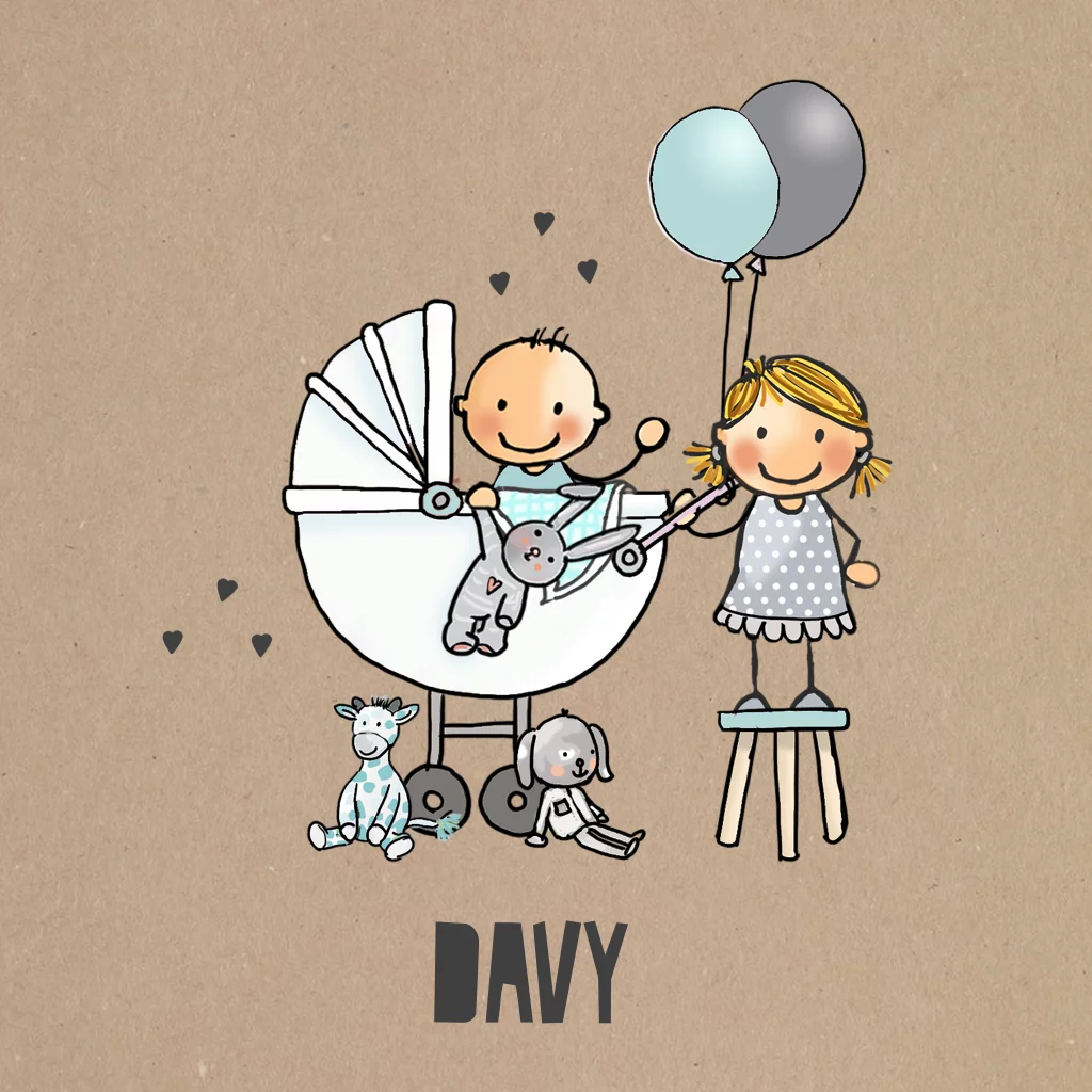 Geboortekaartje jongen 2de kindje in een kinderwagen met grote zus ernaast en ballonnen, leuke pijltjes en hartjes met vogeltjes, super lief geboortekaartje. (5041)