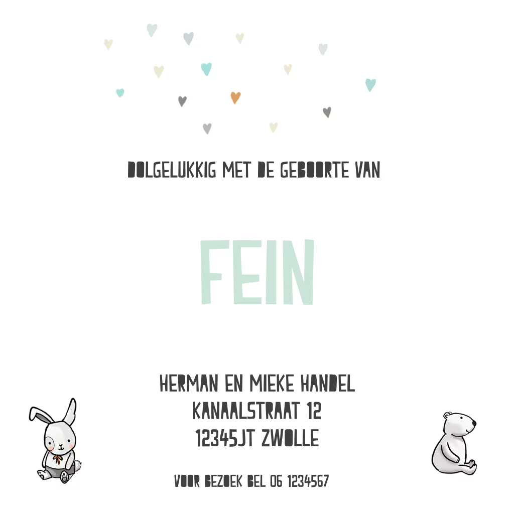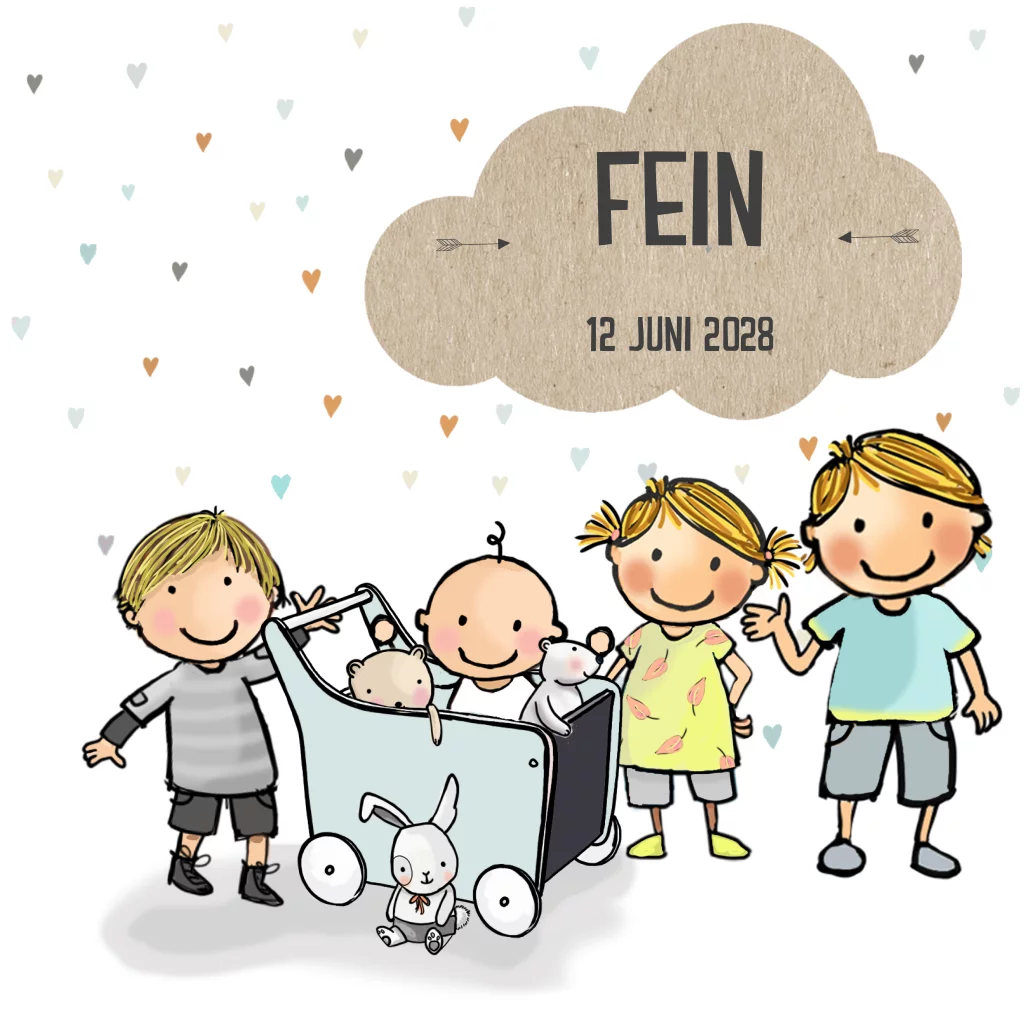 Geboortekaartje loopkar jongen 4e kindje met knuffels