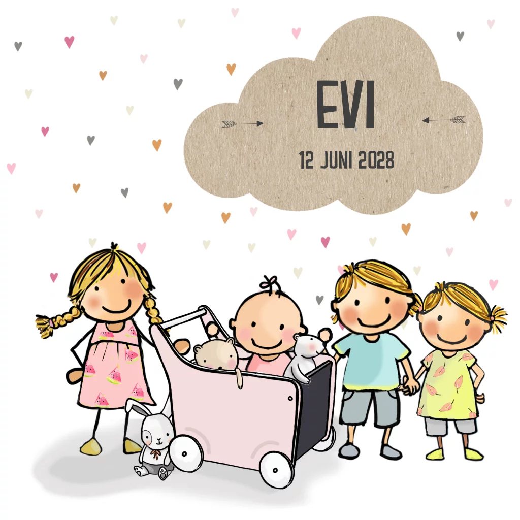 Geboortekaartje meisje vierde kindje met knuffels en wolk, leuke pijltjes en hartjes met vogeltjes, super lief geboortekaartje. (5396) Geboortekaartje Evi