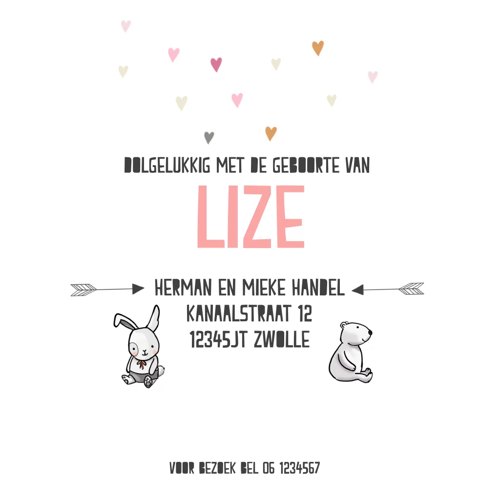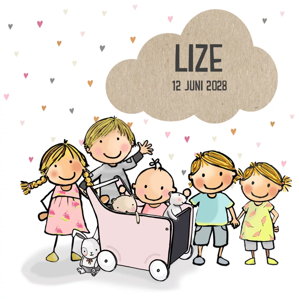 Geboortekaartje meisje 5e kindje met grote broer en 3 zussen. Getekend in een kar met knuffels en wolk, leuke pijltjes en hartjes met vogeltjes, super lief geboortekaartje. (5396)