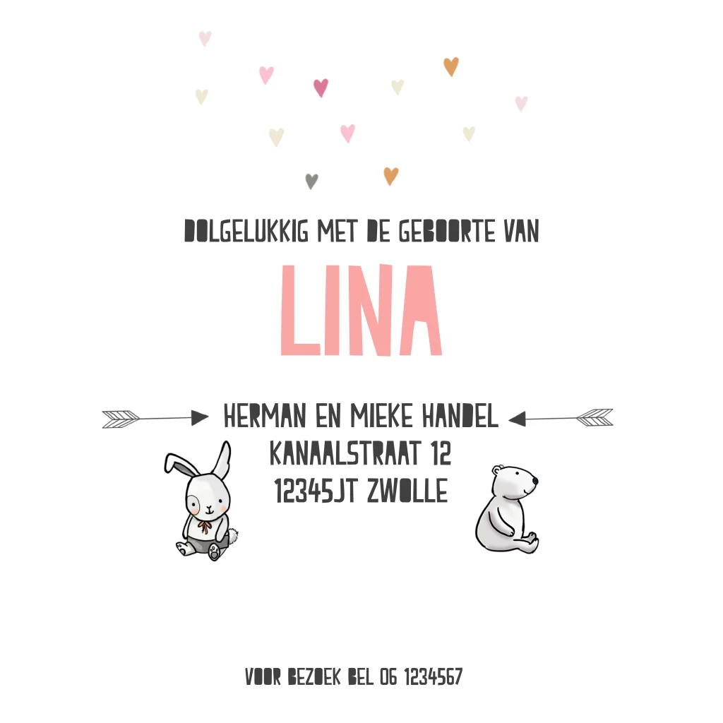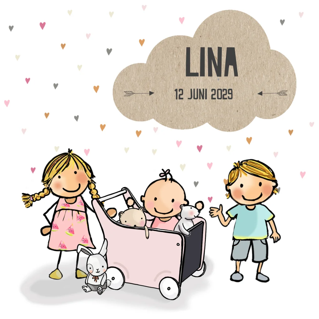 Geboortekaartje 3de kindje meisje en zus met broertje met knuffels en wolk, leuke pijltjes en hartjes met vogeltjes, super lief geboortekaartje. (5396)