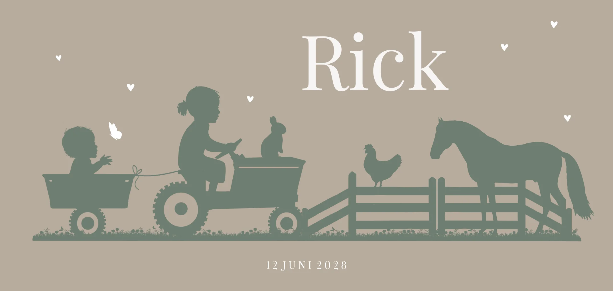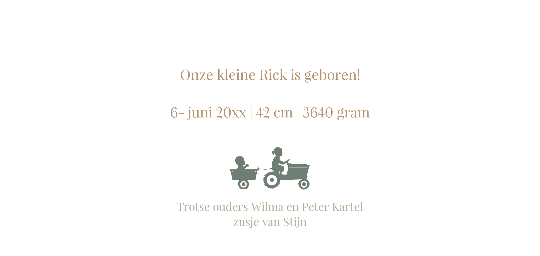 Langwerpige geboortekaart jongen 2e kindje zus met tractor en hekje