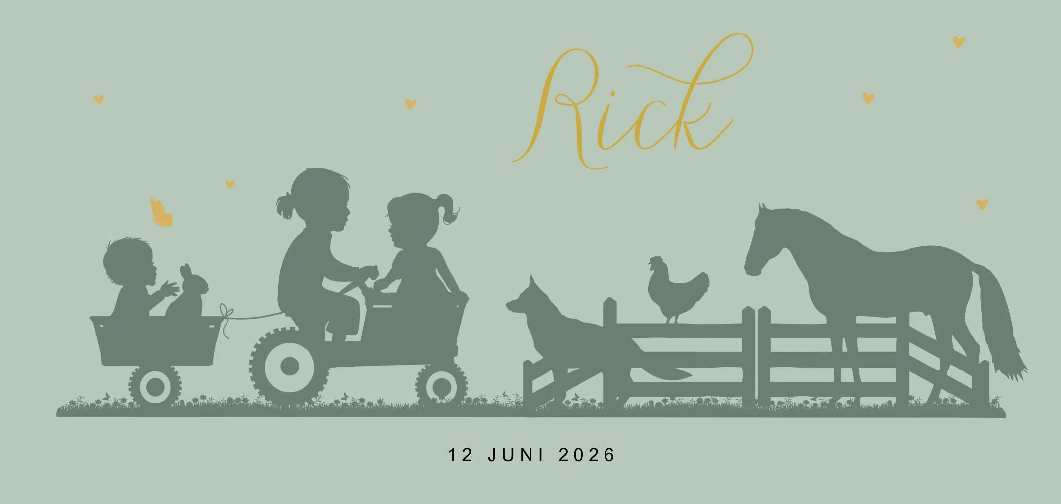 Langwerpig geboortekaartje jongen 3e kindje zusjes met tractor en hekje. (20967)