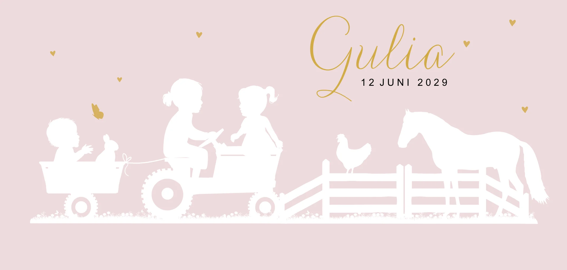 Langwerpige geboortekaart met 3 zusjes 3e kindje meisje met tractor en baby hekje met paard en haan. Boerderij. (20968) geboortekaartje paard