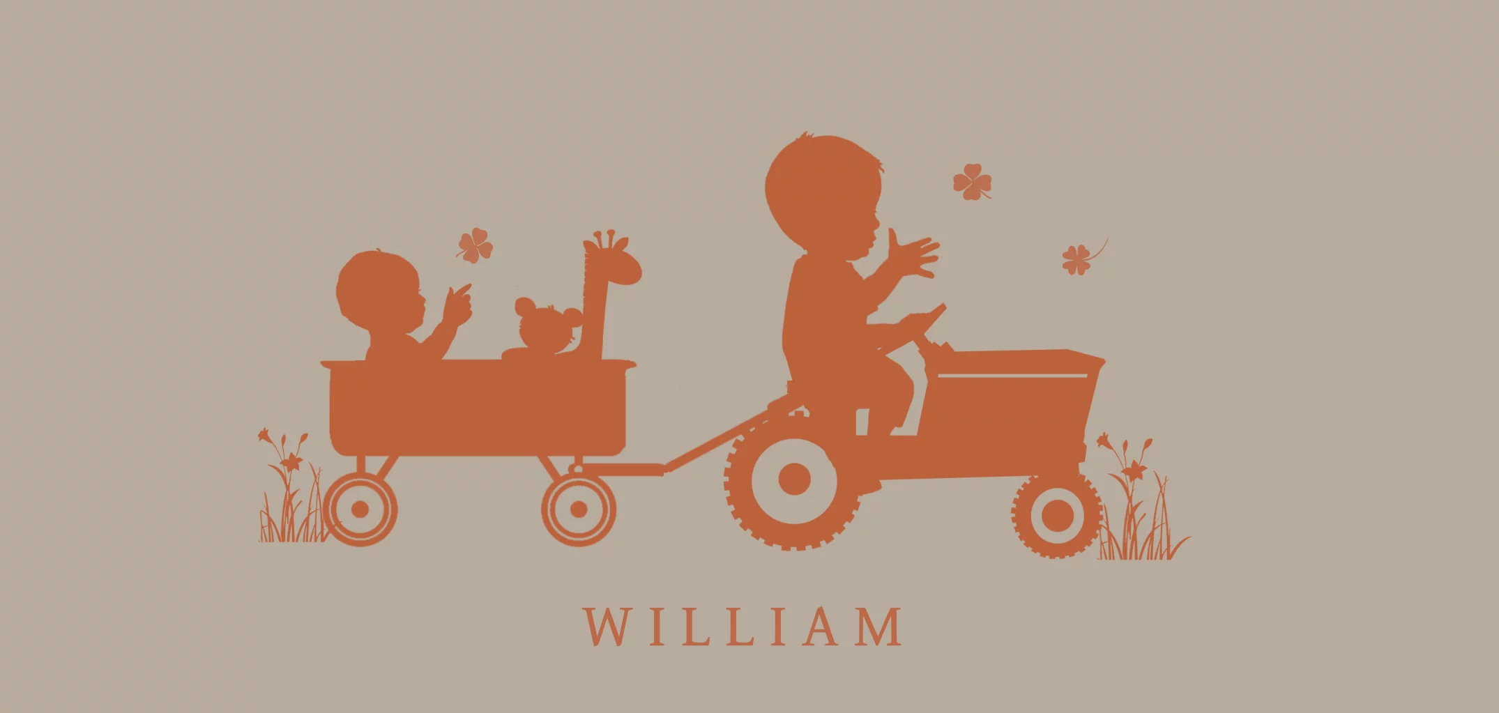 Langwerpig geboortekaart broertje 2de kindje op tractor met broertje in bakje met giraf en beer. (7182)