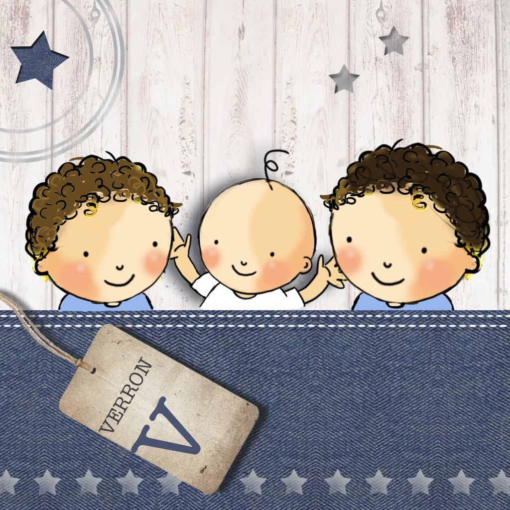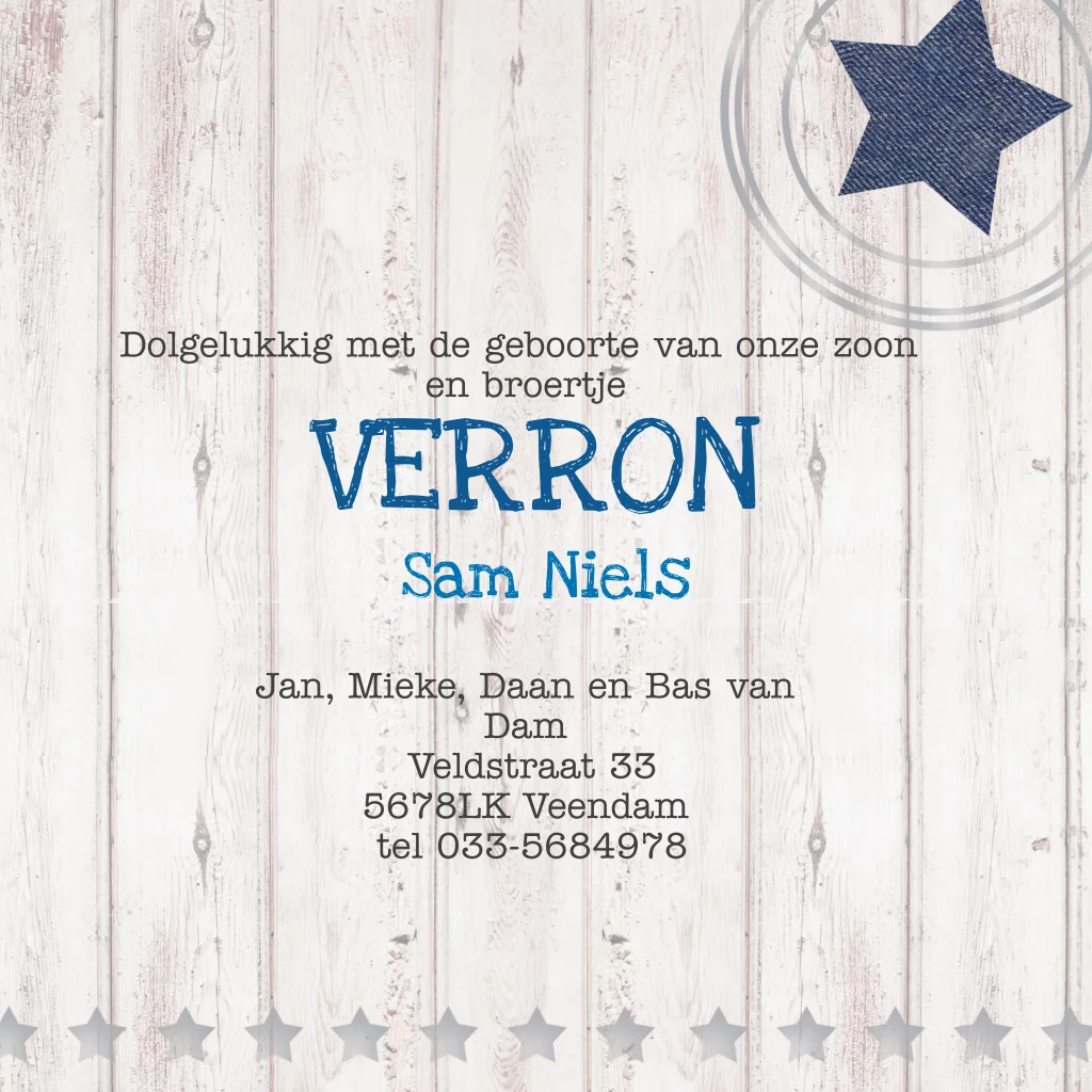 Leuk geboortekaartje jongen derde kindje met hout. Blauw spijkerstof en zilveren sterren. (1822)