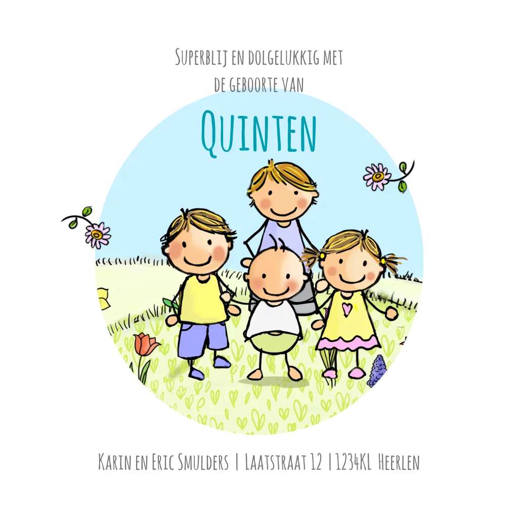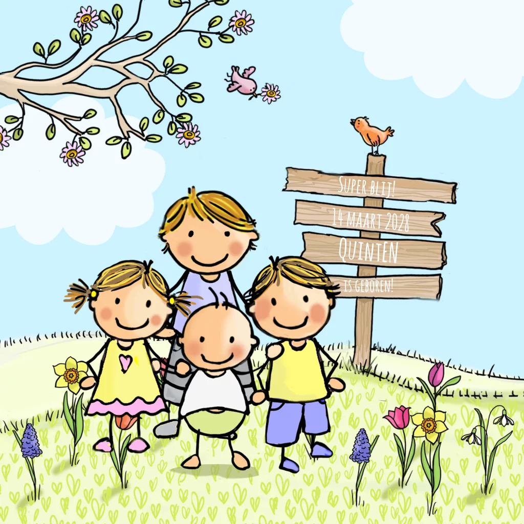Vrolijk getekend geboortekaartje voor een 4e kindje jongen in lente landschap, getekend door Anet. Leuk schattig lente geboortekaartje geïllustreerd. (2582)
