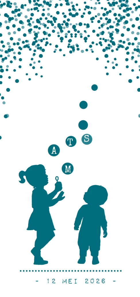 Modern 2e kindje geboortekaart jongen en zusje met bellenblaas in petrol trendkleur. (4975)