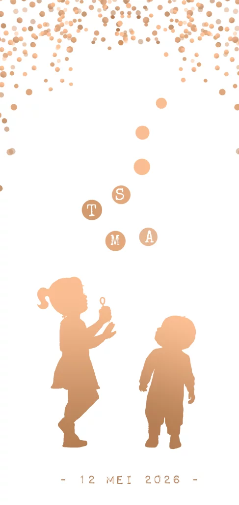 Bellenblaas geboortekaartje jongen voor een tweede kindje met grote zus met bellenblaas in rose goud-look. (4975)