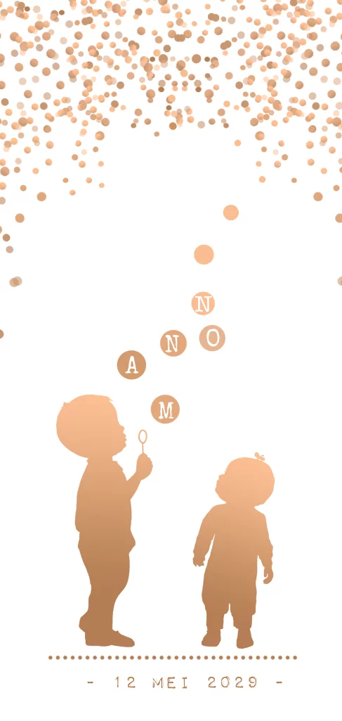Geboortekaart tweede kindje meisje en broer met bellenblaas in rose goud-look. (4975). Deze kaart is nu voorzien van ronde hoeken (meerprijs € 0,30). Wil je rechte hoeken? Zet het om bij achtergrond in de kaartenmaker.