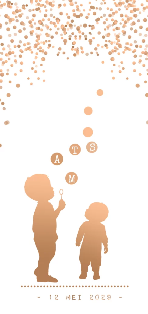 2de kindje geboortekaart jongen in rose goud-look met silhouetjes kindjes en bellenblaas. (4975)