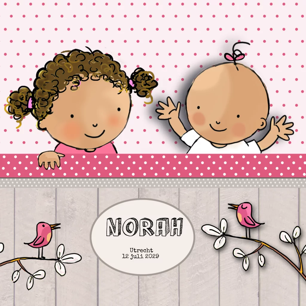 Multi cultureel geboortekaartje 2 kindje voor een meisje met een grote zus met getinte kindjes. (1639)