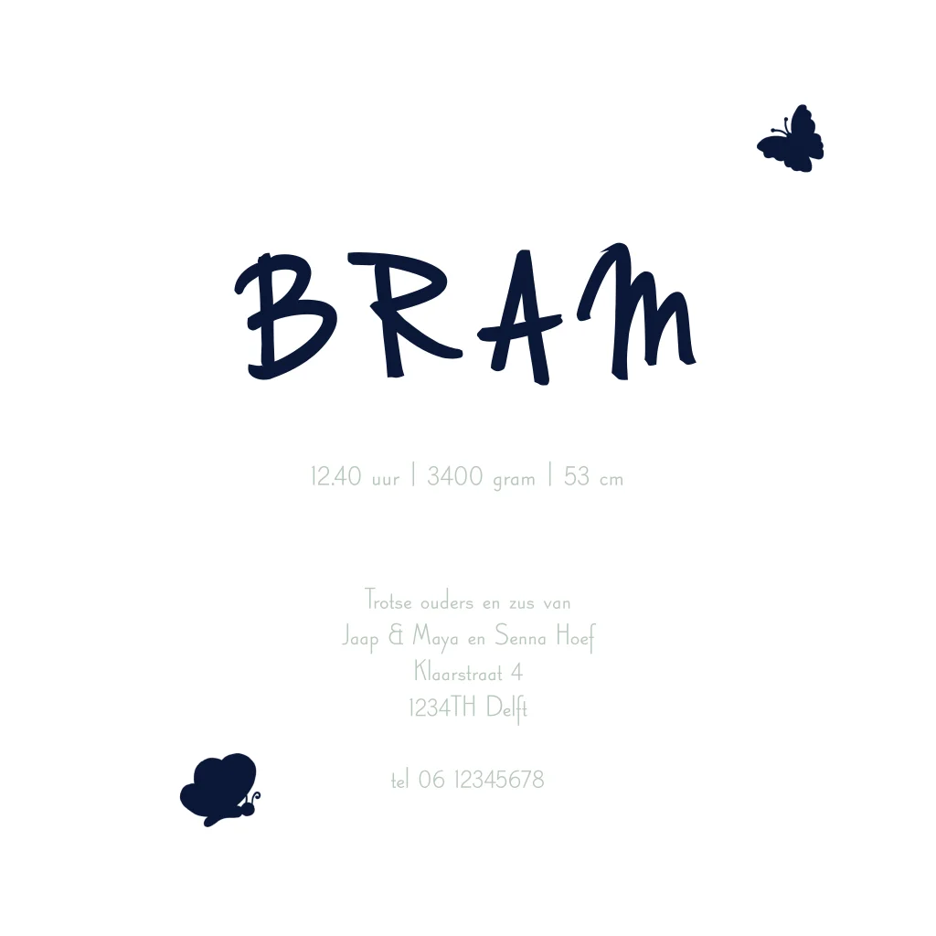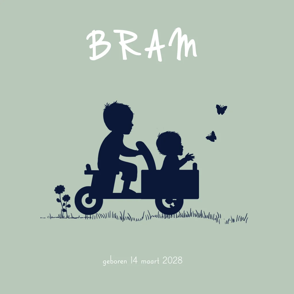 Silhouette 2e jongen geboortekaartje grote broer met baby broertje in houten fietskar. (8285) Geboortekaartje Bram