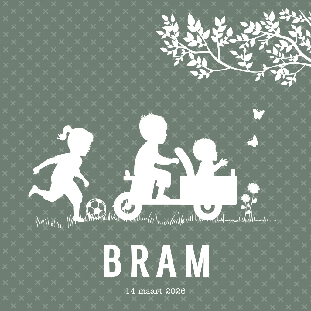 Geboortekaartje voor de geboorte van een derde kindje met silhouetten grote broer en grote zus met baby broertje in houten fietskar. (8285).Wil je een andere kleuren of andere samenstelling van broer(s)/zus(sen) op het kaartje? Dat kan. Als het niet lukt dit aan te passen, neem dan contact op.