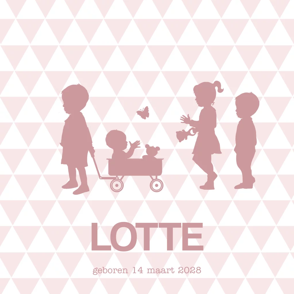 Bolderwagen geboortekaartje broer met zusje in kar vierde kindje