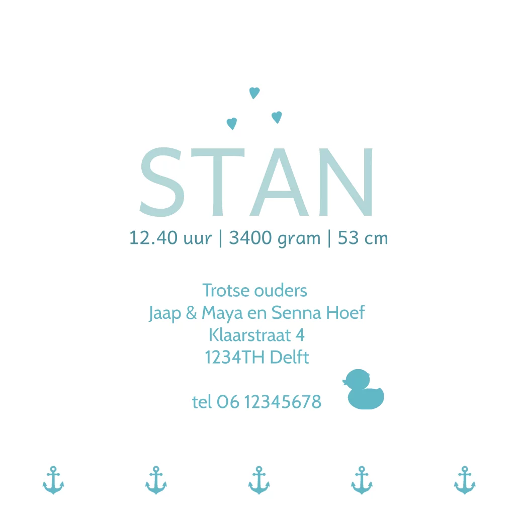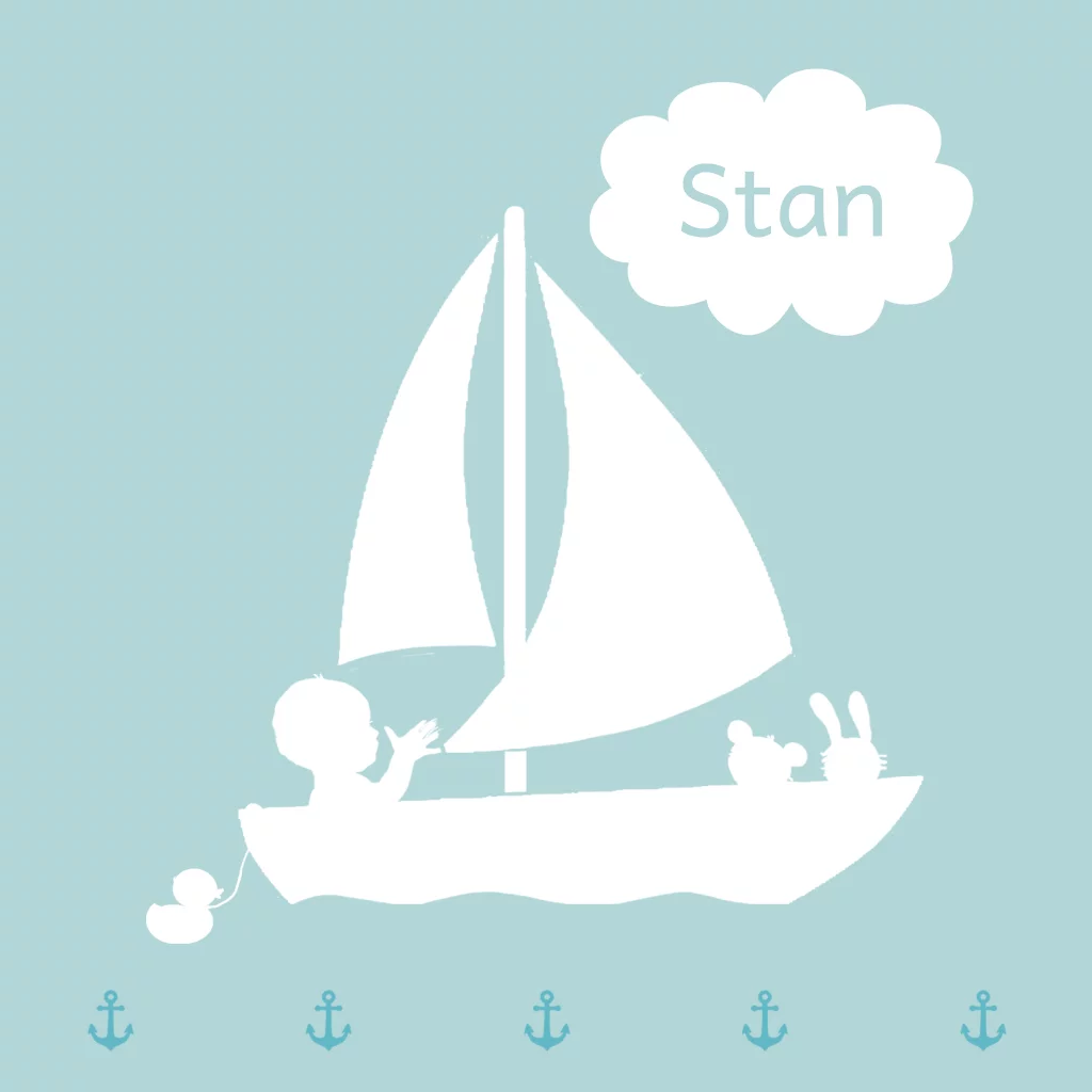 Silhouet geboortekaartje jongen in zeilbootje met knuffels en wolk met naam. (5283)