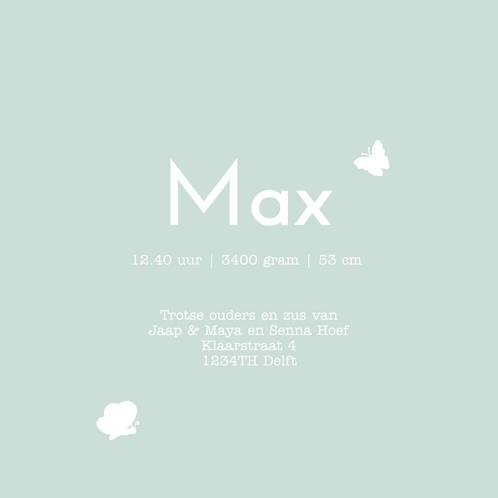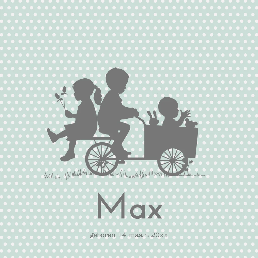 Geboortekaartje 3e kindje broertje voor een derde kindje bakfiets met profielen van grote broer en zus op de bakfiets / fiets. De kleuren zijn naar wens aan te passen. (4109)