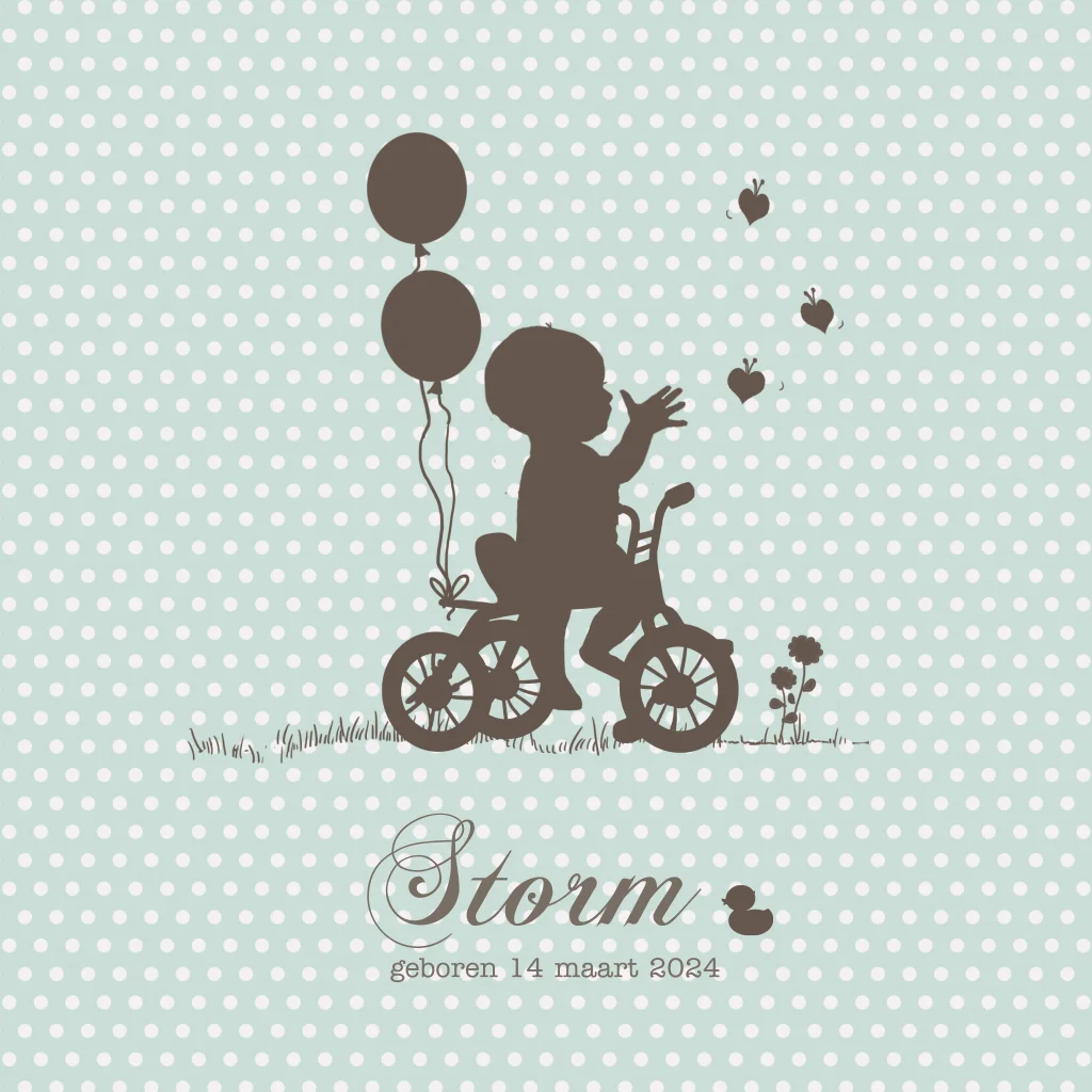 Profiel geboortekaartje zoon op driewieler met ballon
