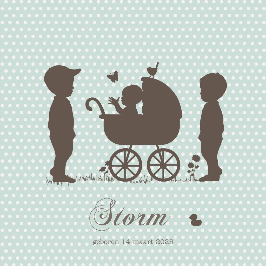 Silhouette geboortekaartje broertje derde kindje met 2 grote broers. Met kinderwagen en rondjes patroon. (2666)
