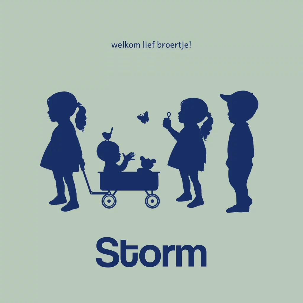 Silhouet geboortekaartje 4e kindje met 2 zussen en een grote broer met baby broertje in kar in hippe frisse kleuren. 4e kindje. (4484)
