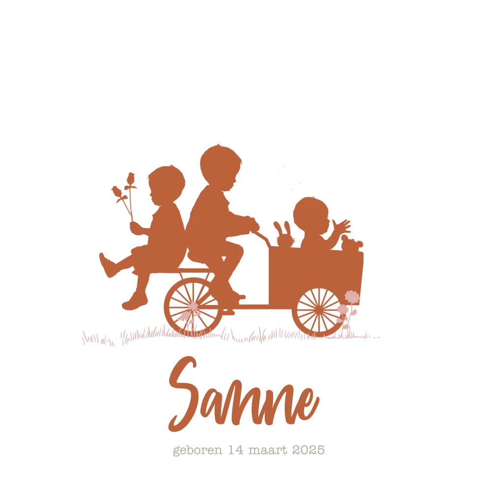 3e kindje geboortekaartje voor een baby meisje met 2 broertjes derde kindje op een bakfietsje. (4423)