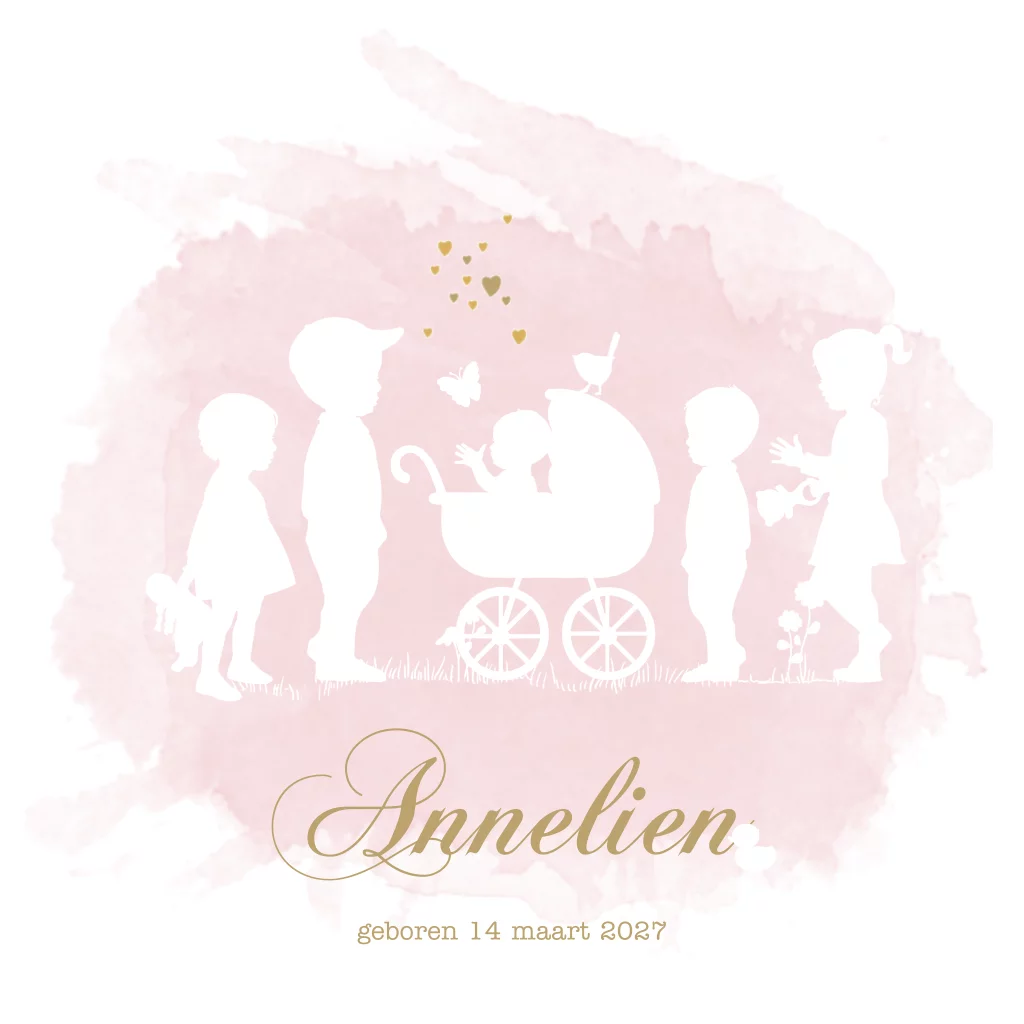 5e kind geboortekaartje meisje met broertjes en grote zus vijfde kindje zusje. Met kinderwagen en waterverf hip roze. (4997)