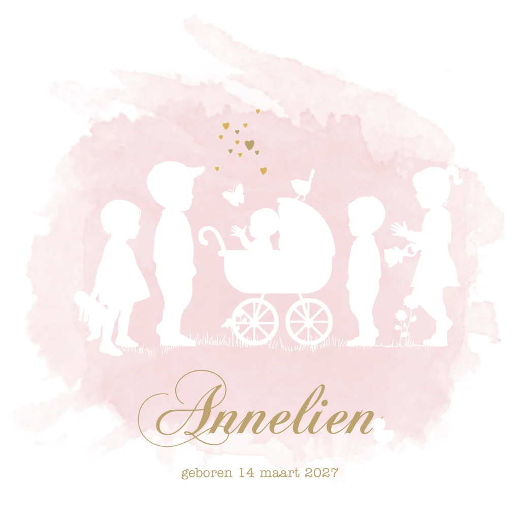 5e kind geboortekaartje meisje met broertjes en grote zus vijfde kindje zusje. Met kinderwagen en waterverf hip roze. (4997) Wil je een andere kleuren of andere samenstelling van broer(s)/zus(sen) op het kaartje? Dat kan. Als het niet lukt dit aan te passen, neem dan contact op.