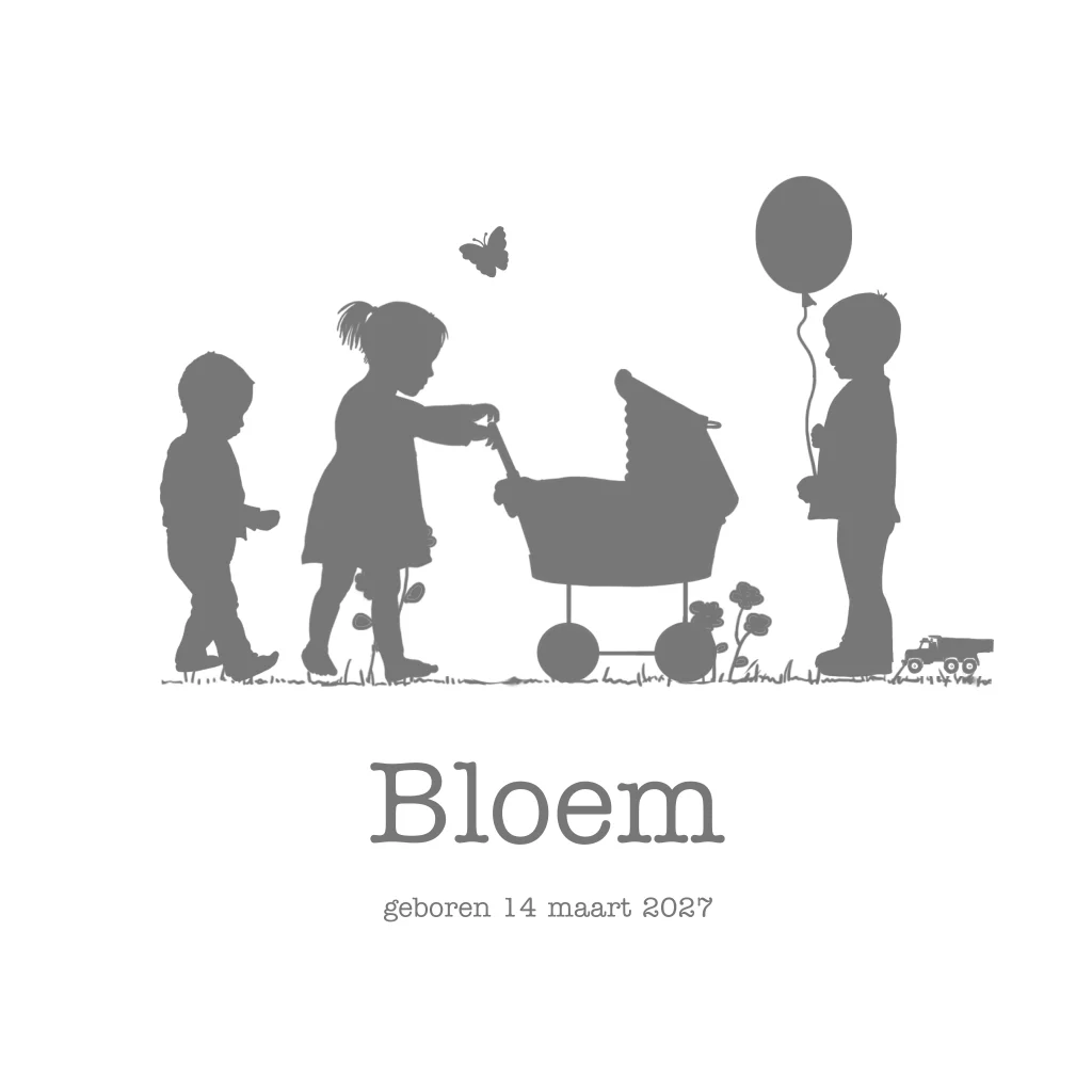 Geboortekaartje voor een meisje wat het 4e kindje is met broers en zus. Met kinderwagen. (1848)Wil je een andere kleuren of andere samenstelling van broer(s)/zus(sen) op het kaartje? Dat kan. Als het niet lukt dit aan te passen, neem dan contact op.