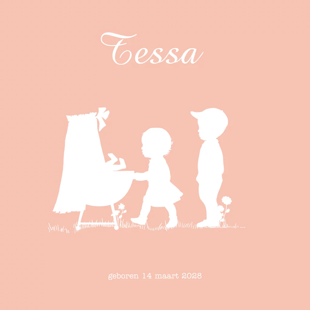 Profiel geboortekaartje voor een 3de kindje meisje in een wieg. Een zus en grote broer naast de wieg. (6251)
