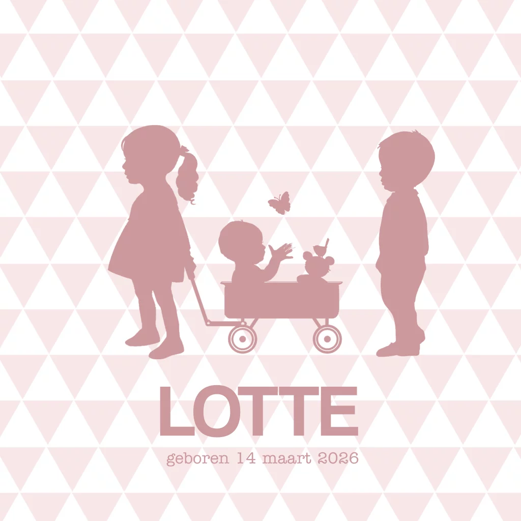 3e kindje geboortekaartje zus en broer met zusje in kar