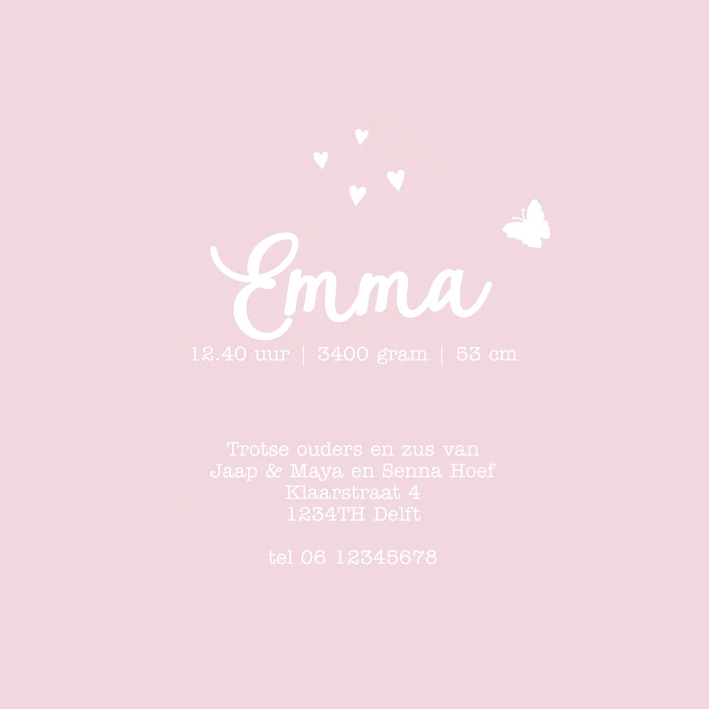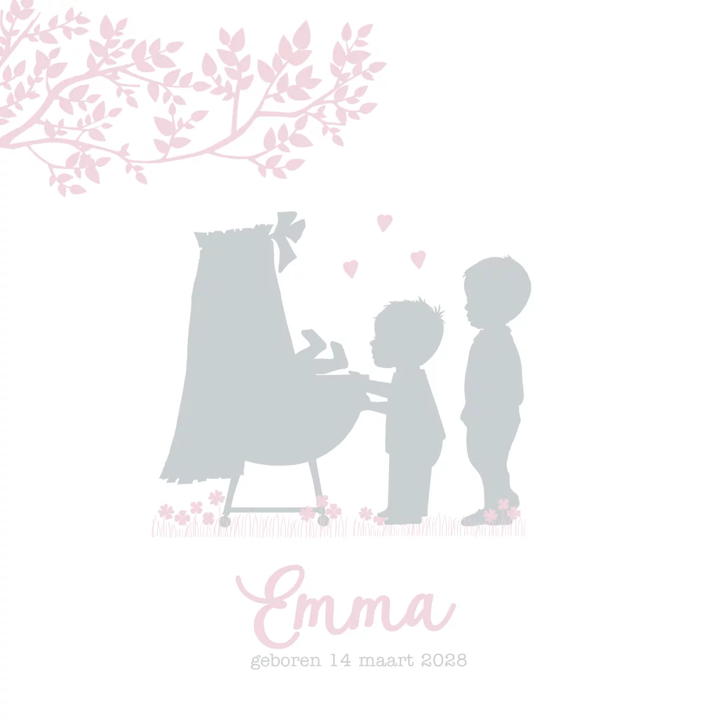 Lief geboortekaartje 3e kindje meisje in een wiegje met 2 grote broers naast de wieg. (6699)