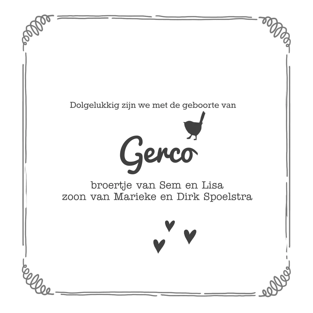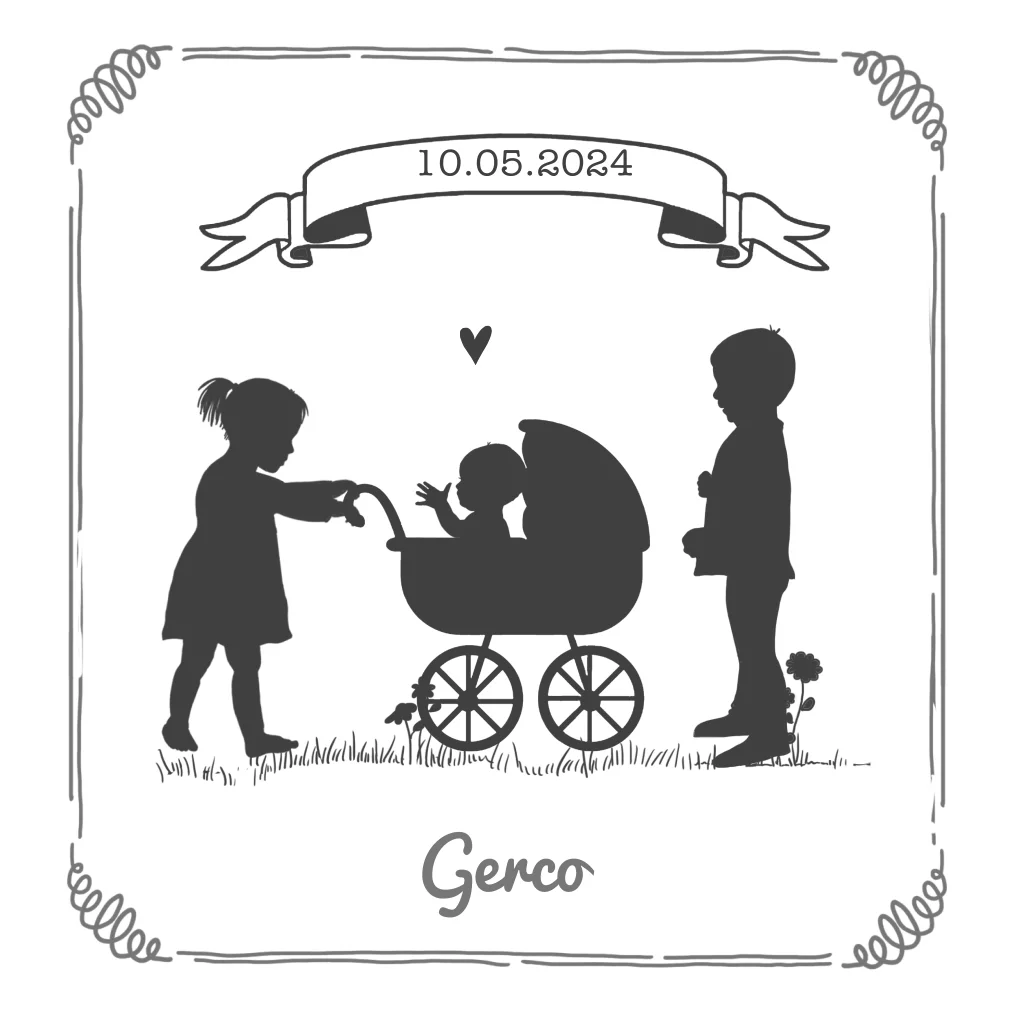 3e kindje hollandse geboortekaart met banner en rand, voor baby met broer en zus. Het kader is verwijderen en de kleuren zijn naar wens aan te passen. (2678)