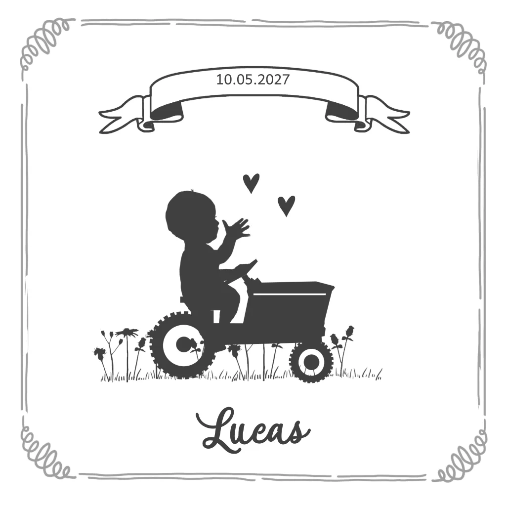 Silhouet hollandse geboortekaartje met jongen op een tractor. De achtergrondkleur is naar wens aan te passen en het kader is te verwijderen. (3616)