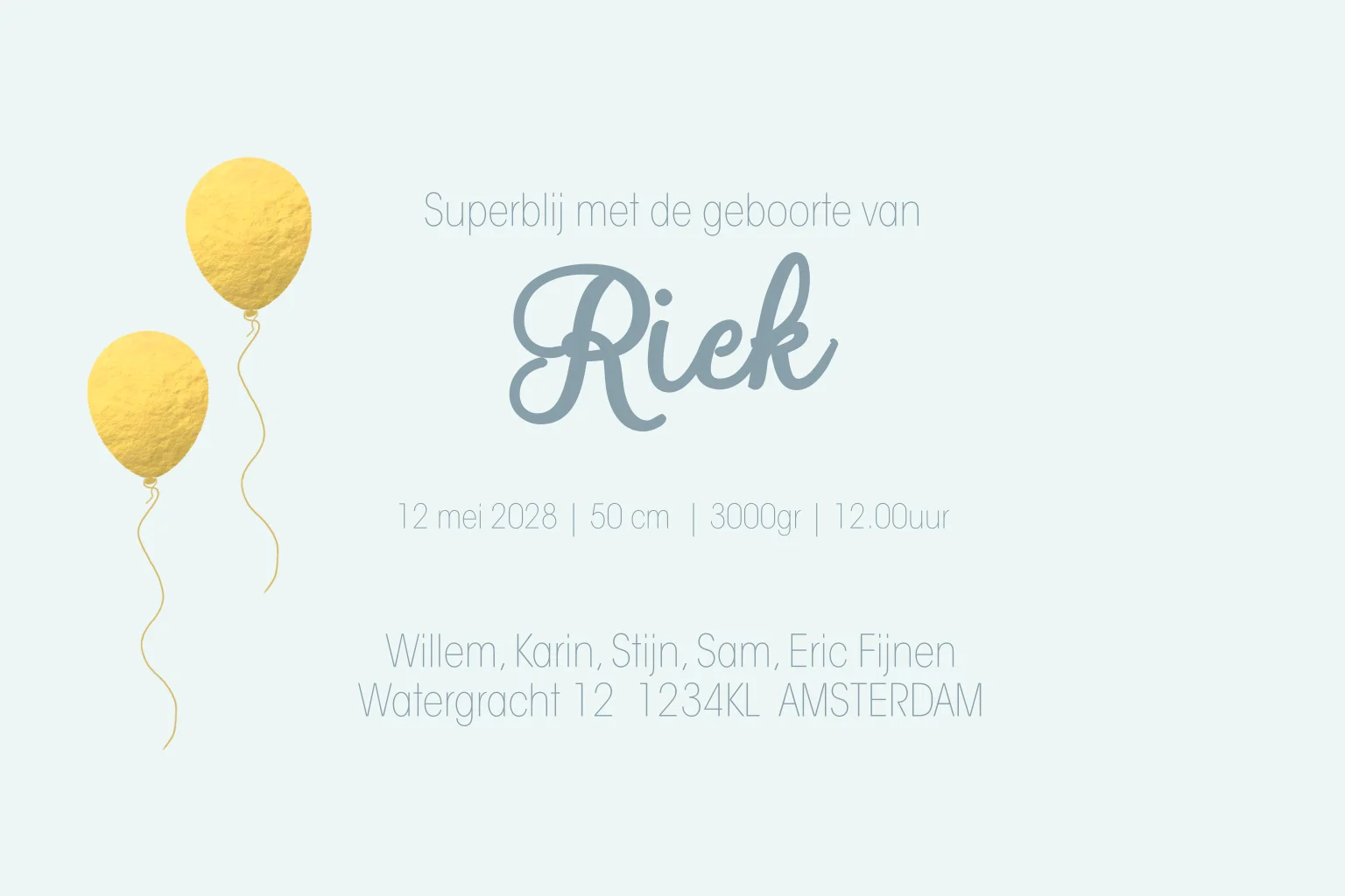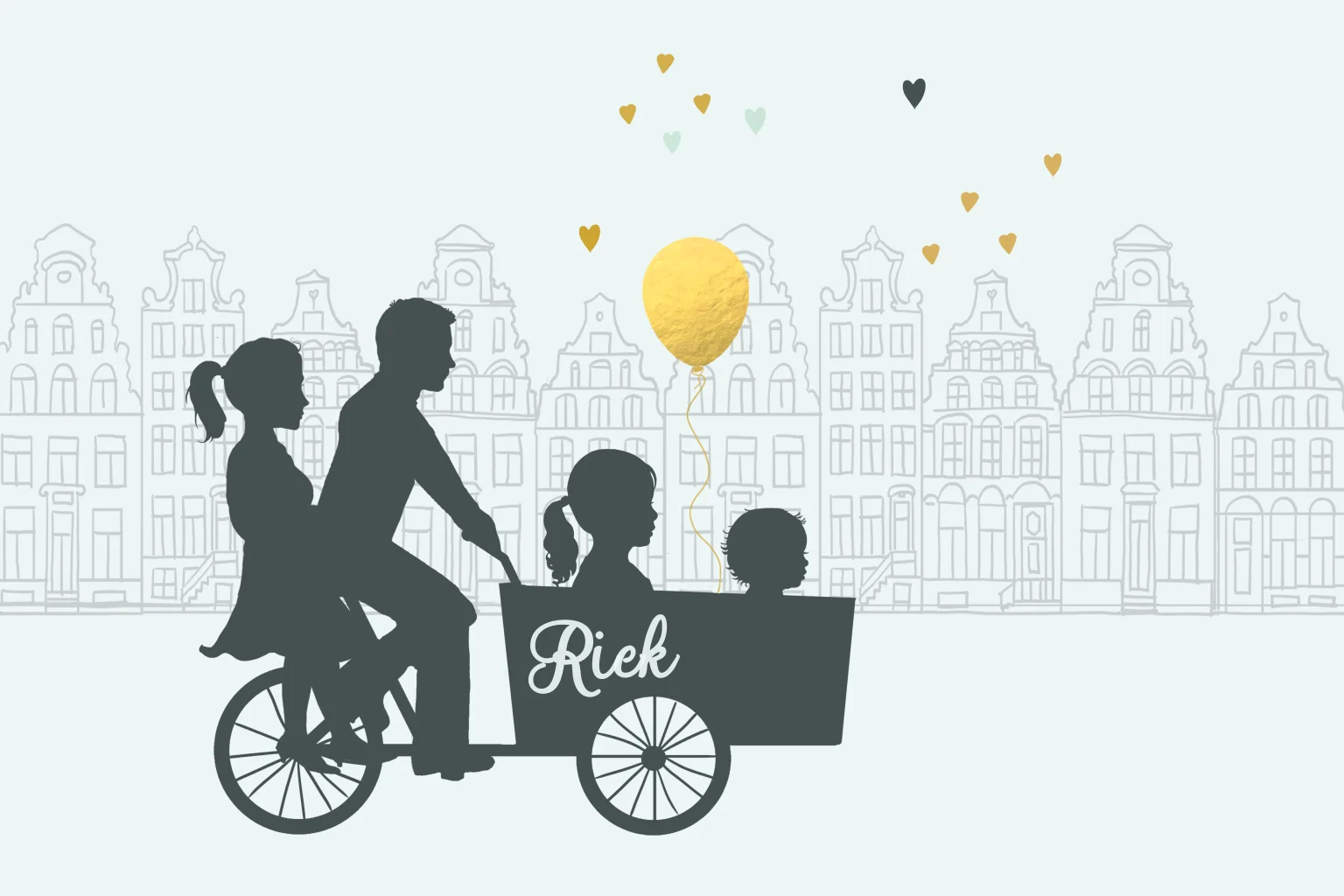 Geboortekaartje jongen Amsterdam bakfiets 2de kindje. Leuke goudkleurige accenten. De gezinssamenstelling kun je via het rechter menu in onze kaartenmaker aanpassen/bewerken. Kies voor de optie "afbeelding en versieringen" voor de verschillende kindjes. (6876)