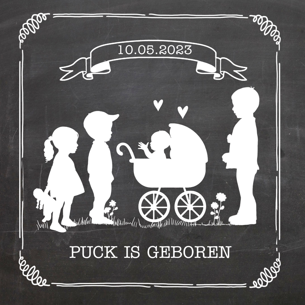 Profiel geboortekaart krijtbord met banner en rand, voor baby vierde kindje. (2678)