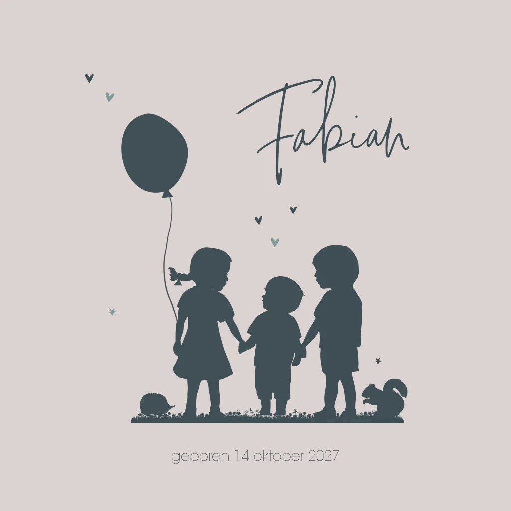 Geboortekaartje 3e kindje silhouet jongen met grote zus en grote broer. 3e kindje en bosdieren aan de binnenkant. (21411)