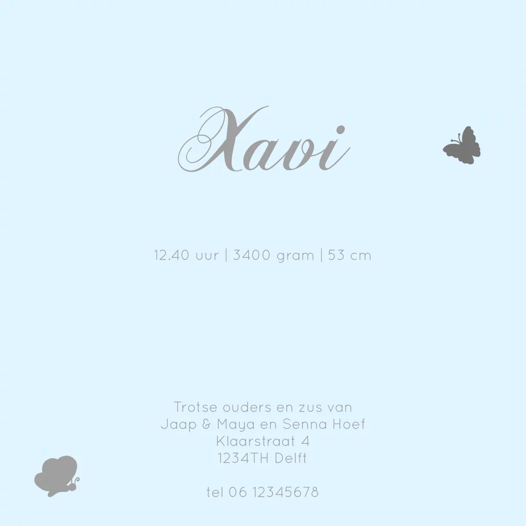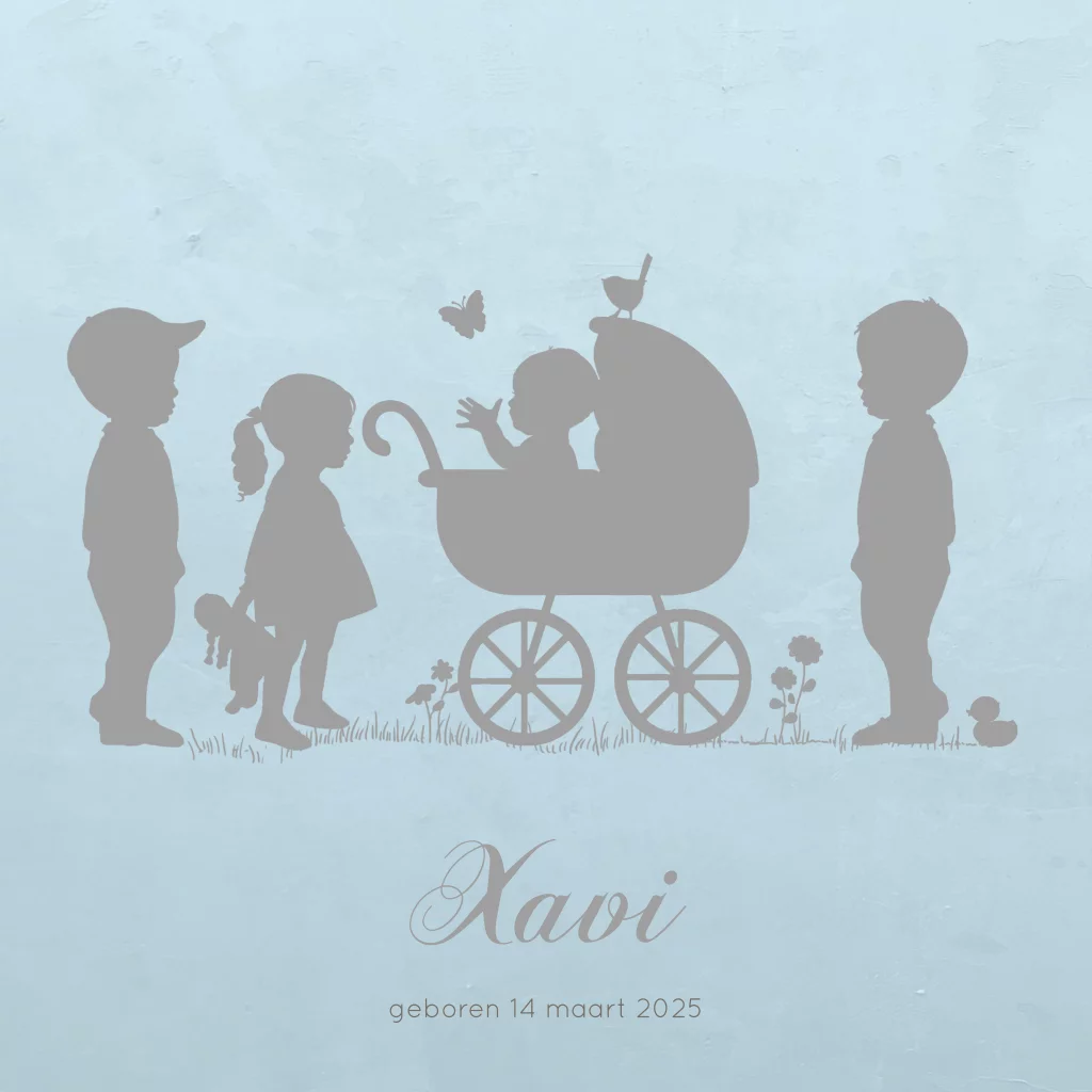 Silhouet geboortekaartje jongen 4e kindje met blauw grijs steen look op de achtergrond. De kleuren zijn naar wens aan te passen. Met kinderwagen 2 grote broers en grote zus. (4365)