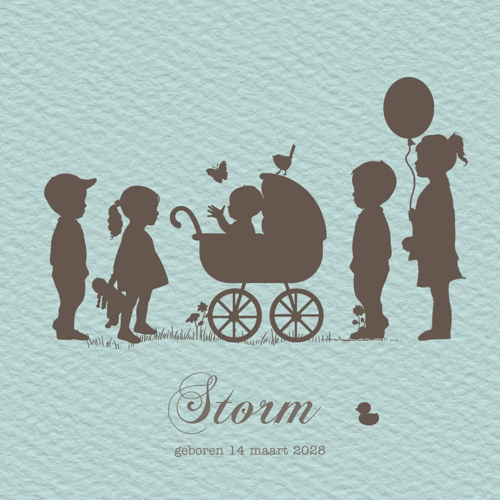 Silhouet geboortekaartje jongen 5e kindje met kinderwagen groene stof met grote broers en zussen. (4362)