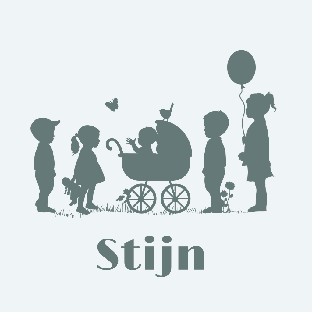 Silhouet geboortekaartje jongen vijfde kindje. Met kinderwagen en mintgroen ruitpatroon. (4367)