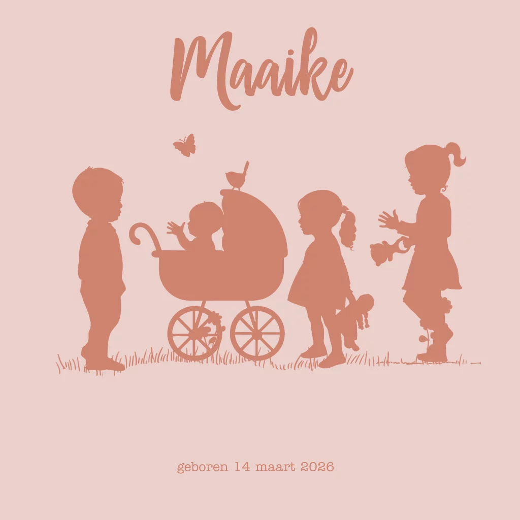 Silhouet geboortekaartje voor de geboorte van een baby-meisje. Dit is een 4e kindje met 2 zussen en een broer. Met kinderwagen en rondjespatroon. (4365)