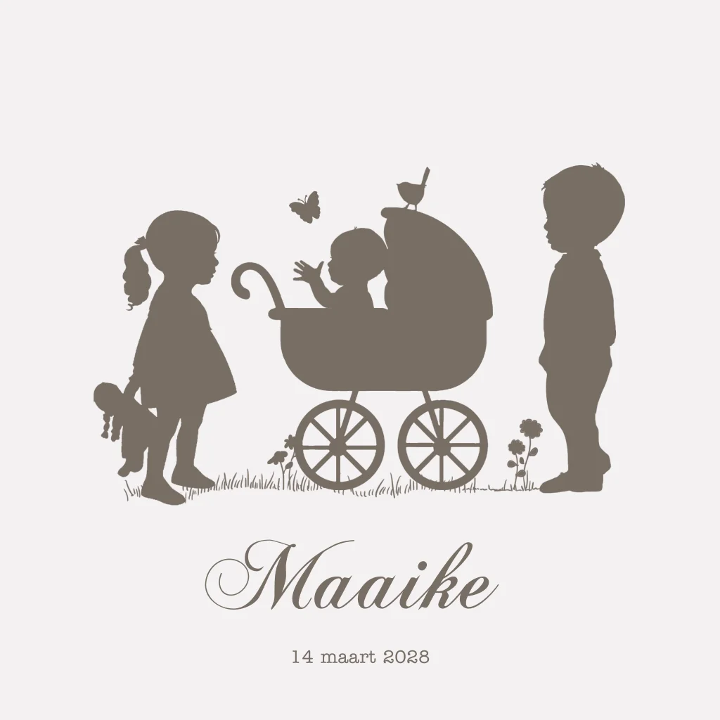 Silhouet geboortekaartje ruitjes meisje derde kindje. Met kinderwagen en ruitjespatroon. (4359)