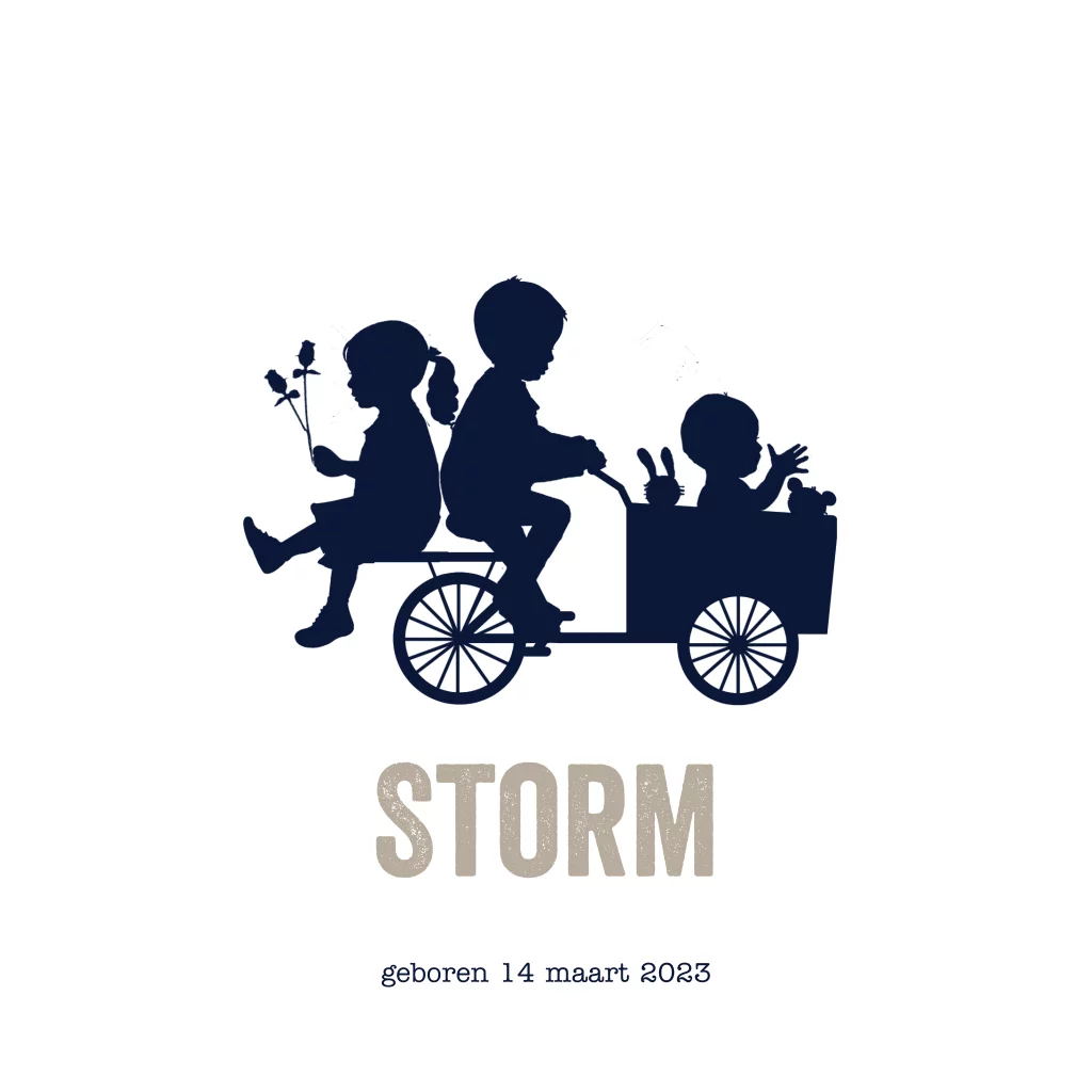 3e kind geboortekaartje voor een jongen met grote broer en zus op een bakfietsje op achtergrond wit kleuren zijn naar wens aan te passen. (4368)