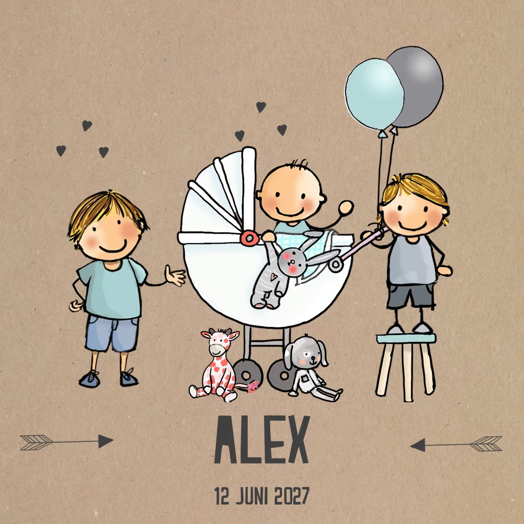 3e kindje geboortekaartje jongen een een wieg. De kindjes zijn zelf aan te passen, te verwijderen of toe te voegen. (5234)