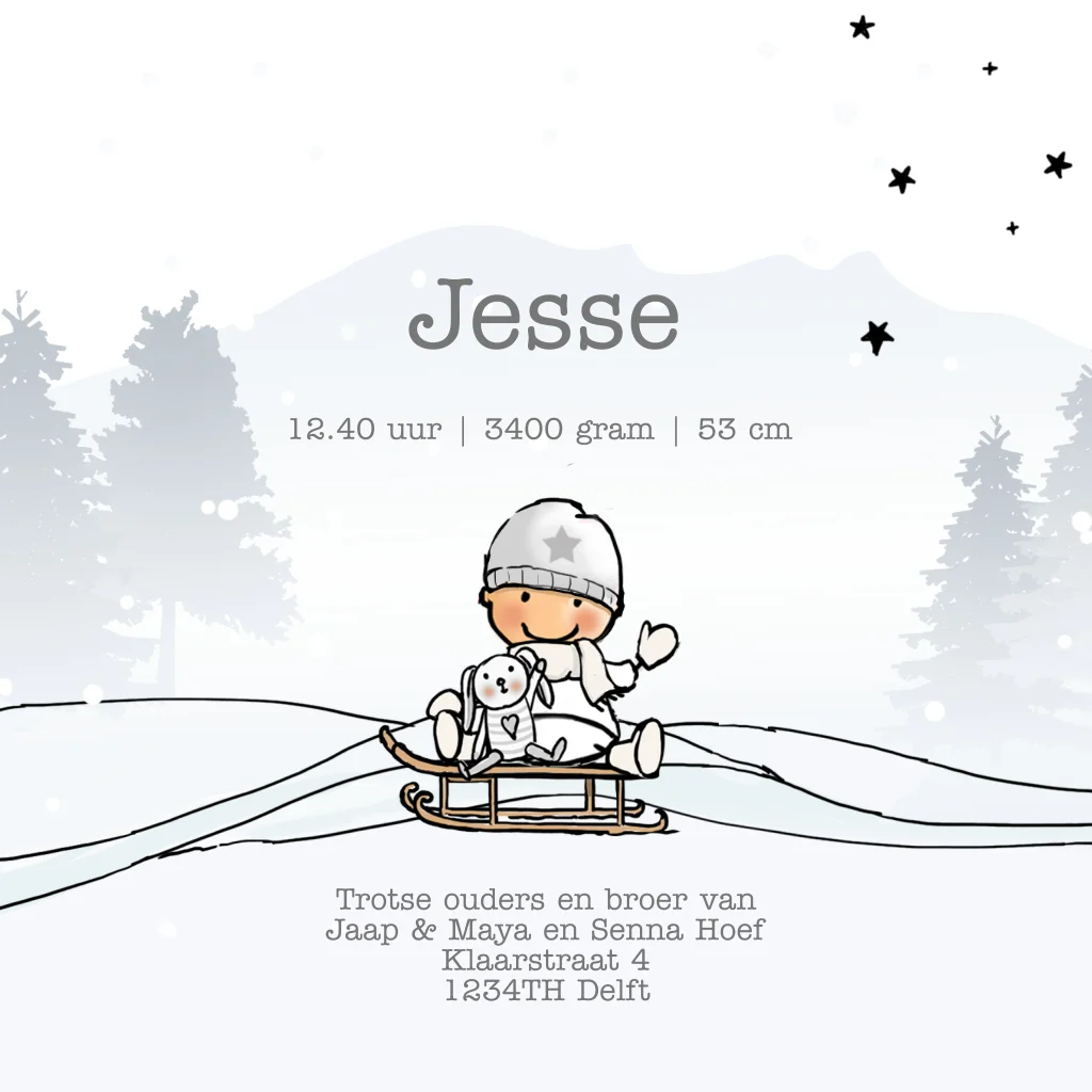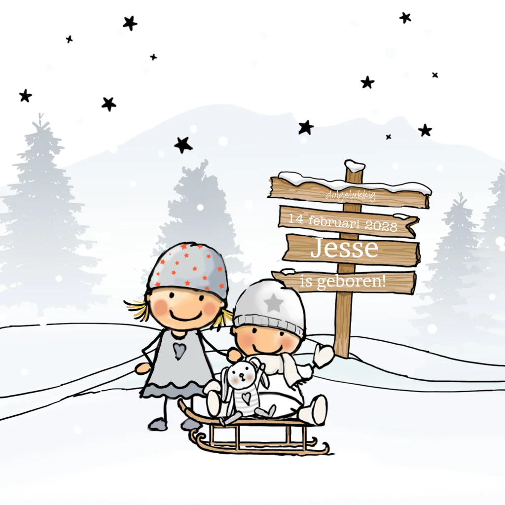 Vrolijk getekend geboortekaartje jongen tweede kindje sneeuw