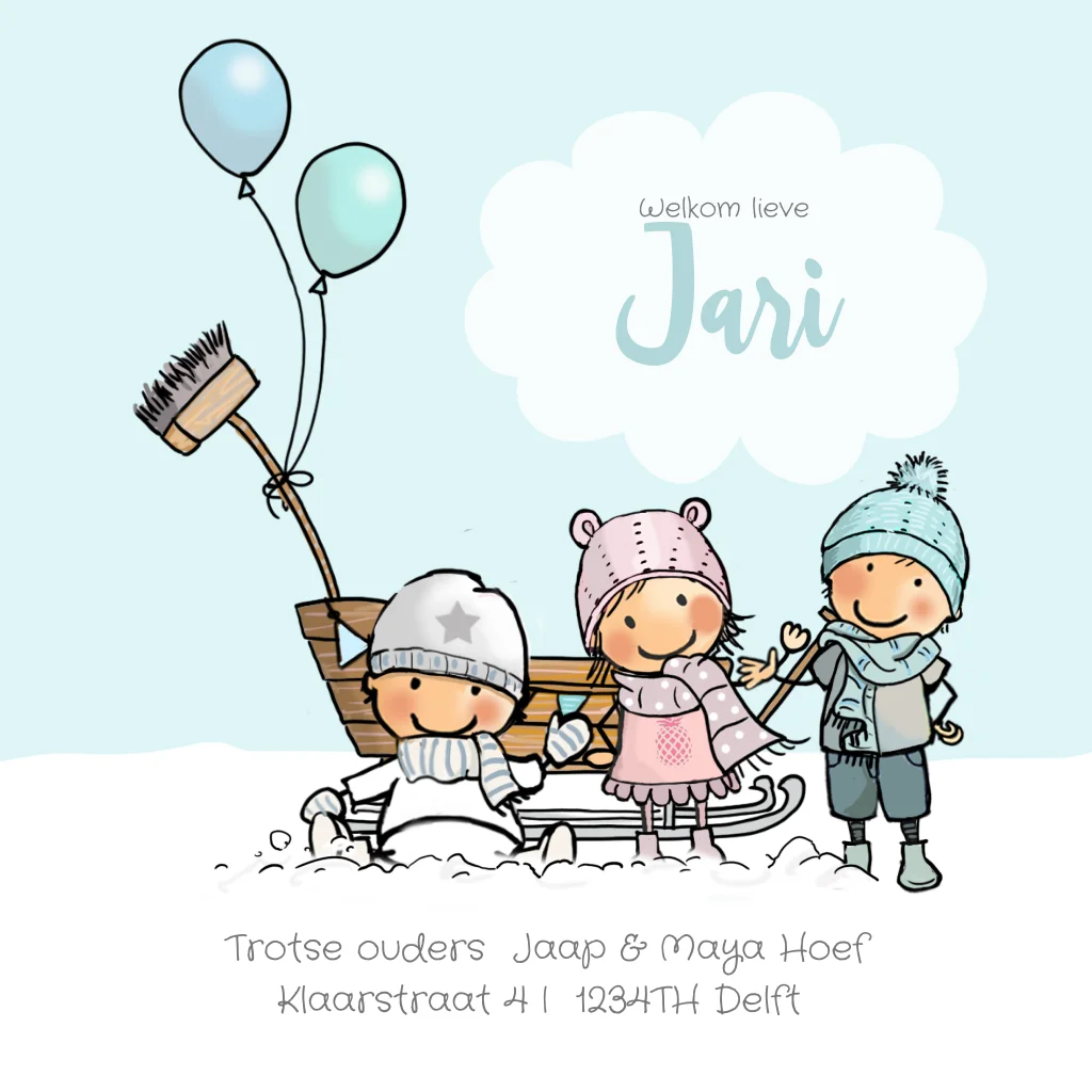 Geboortekaartje 3e kindje winter baby broertje in een slee met sneeuw