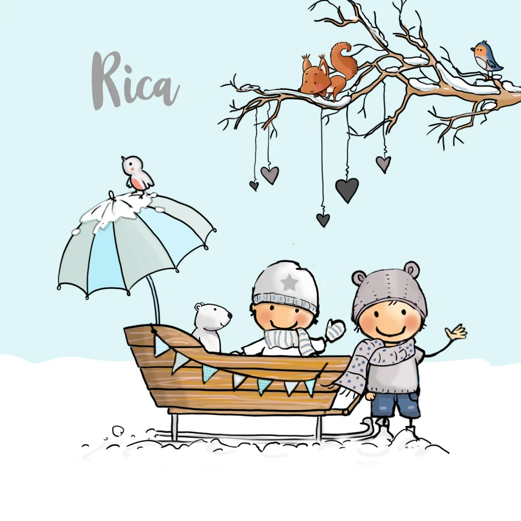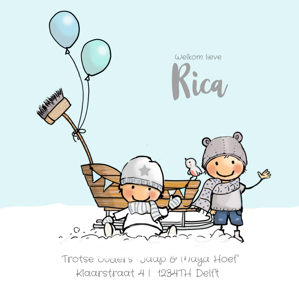 Leuk handgetekend geboortekaartje voor een broertjes in houten slee met winterlandschap. Winters geboortekaartje baby op slee in witte sneeuw. (5830)