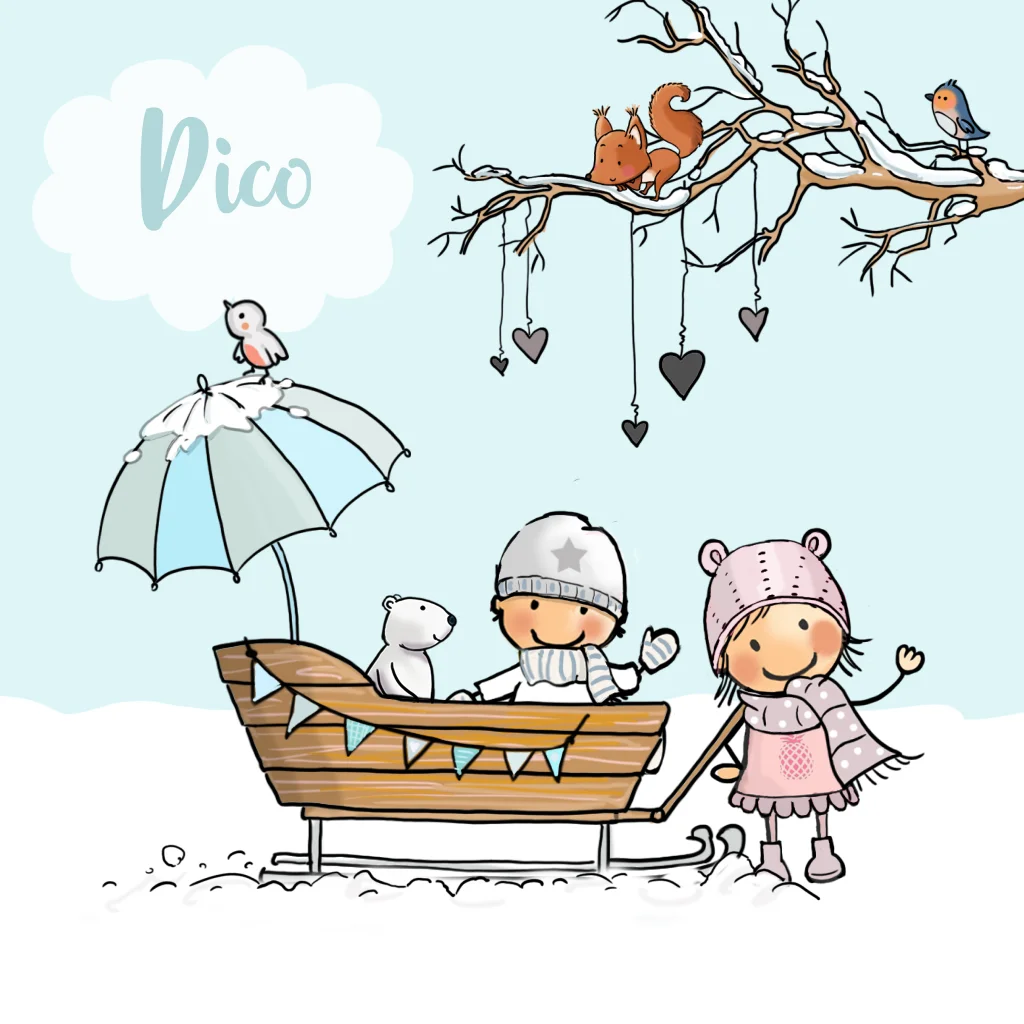 Mooi handgetekend geboortekaartje 2e kindje voor een broertje met grote zus in houten slee met winterlandschap. Winters geboortekaartje baby op slee in witte sneeuw. (5829)